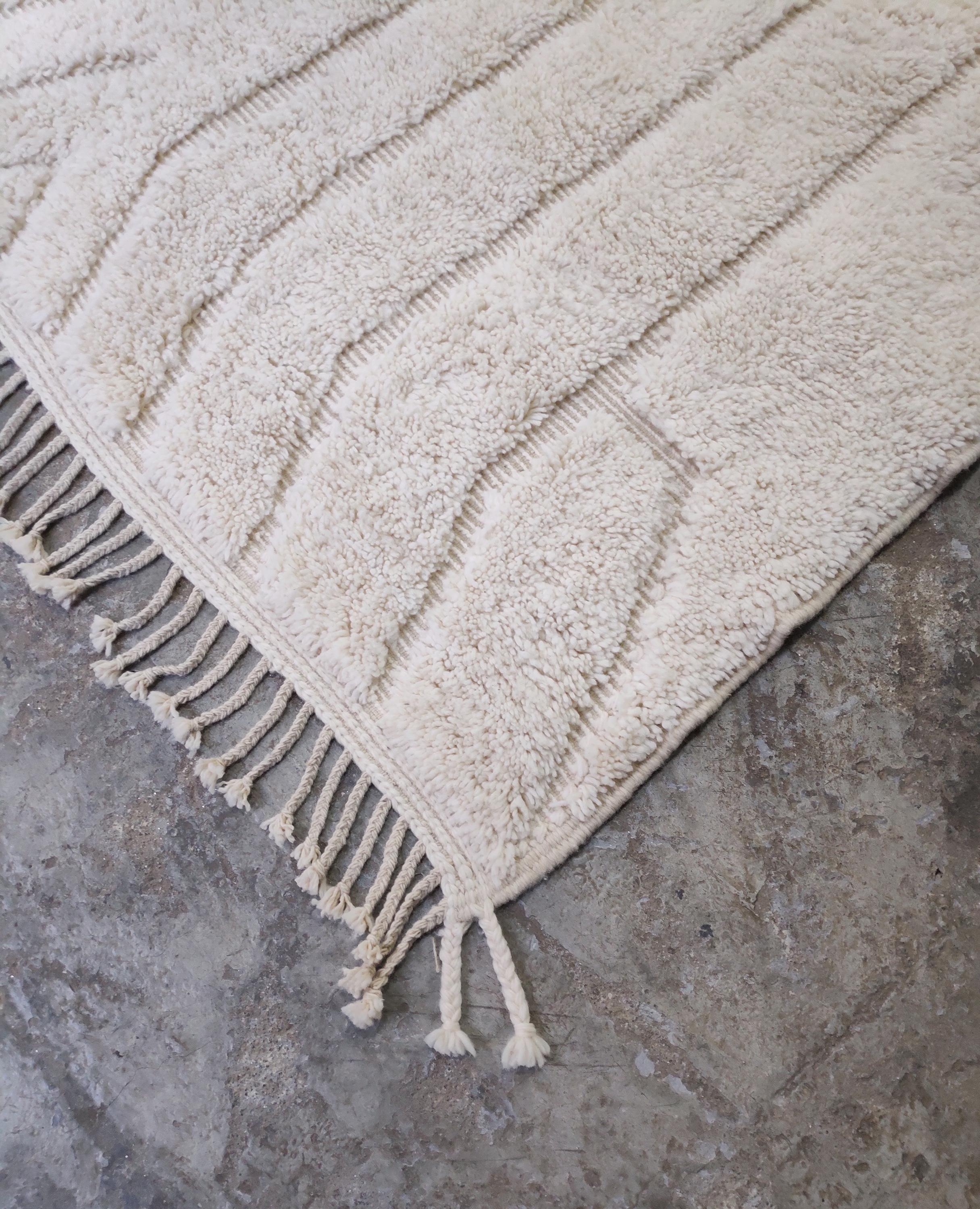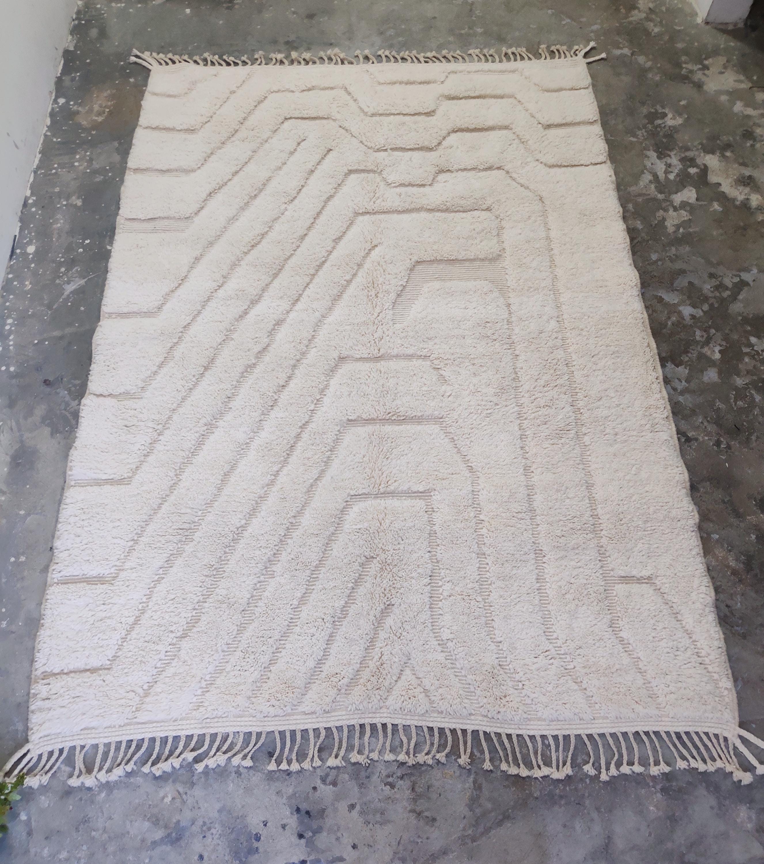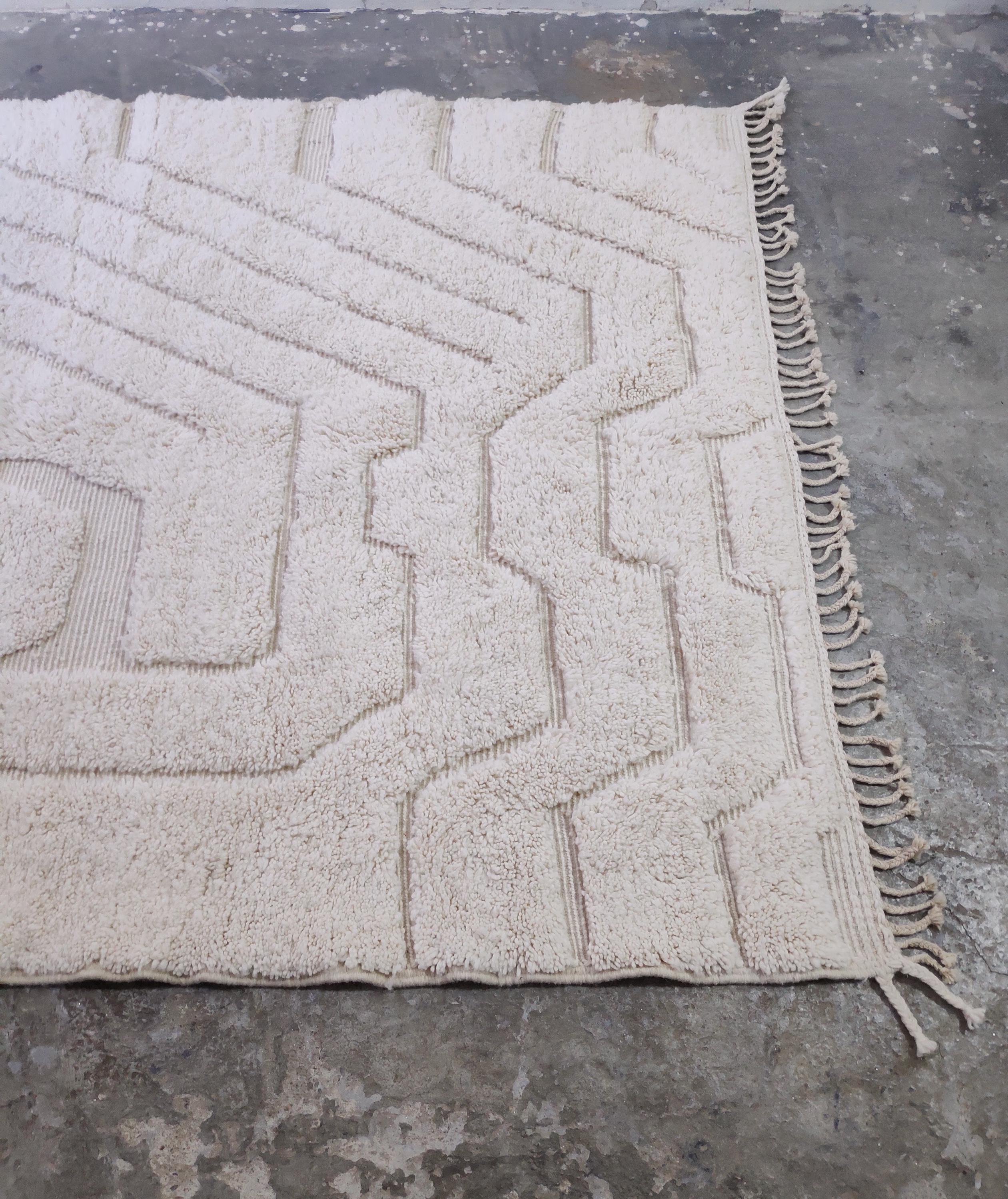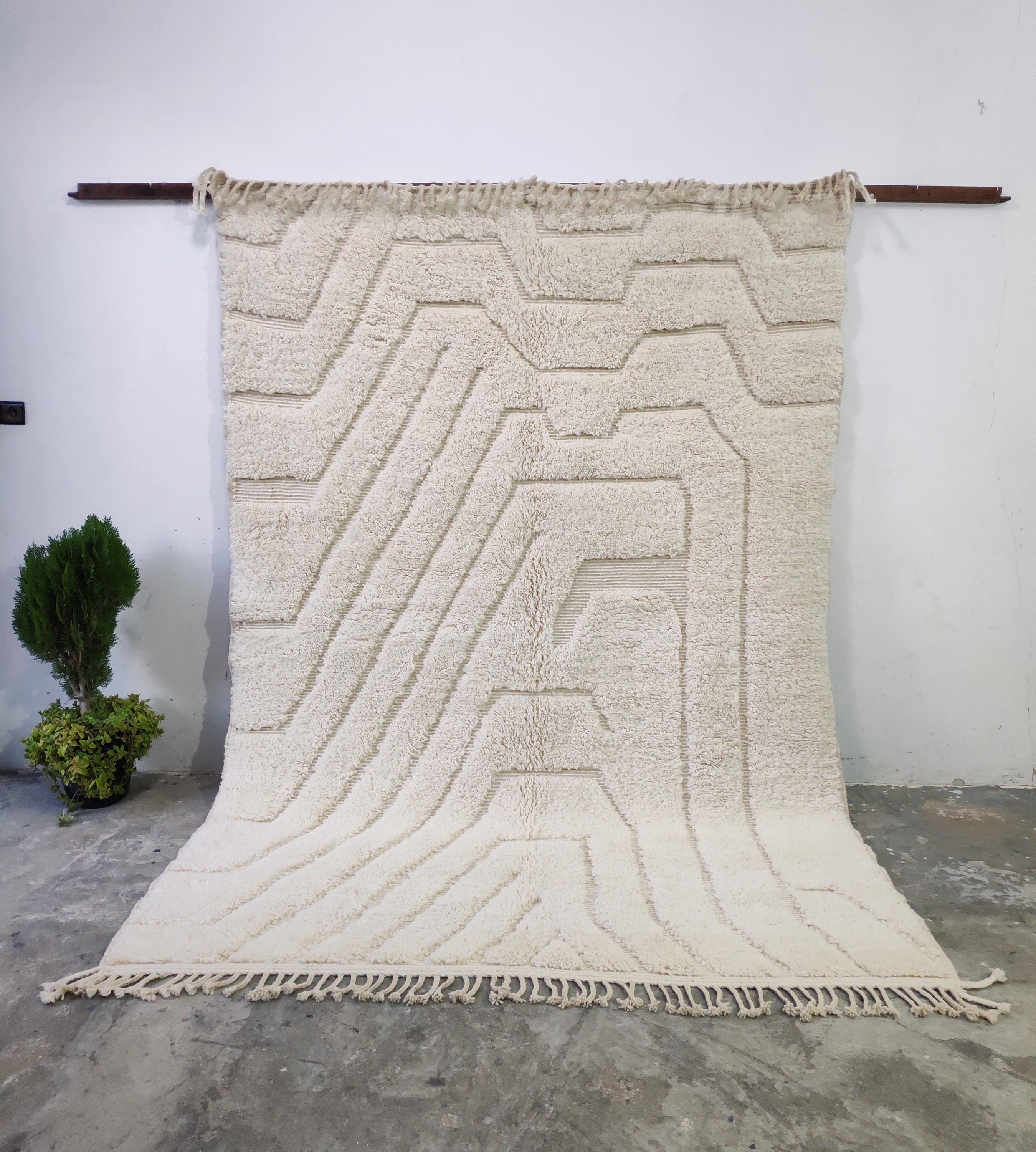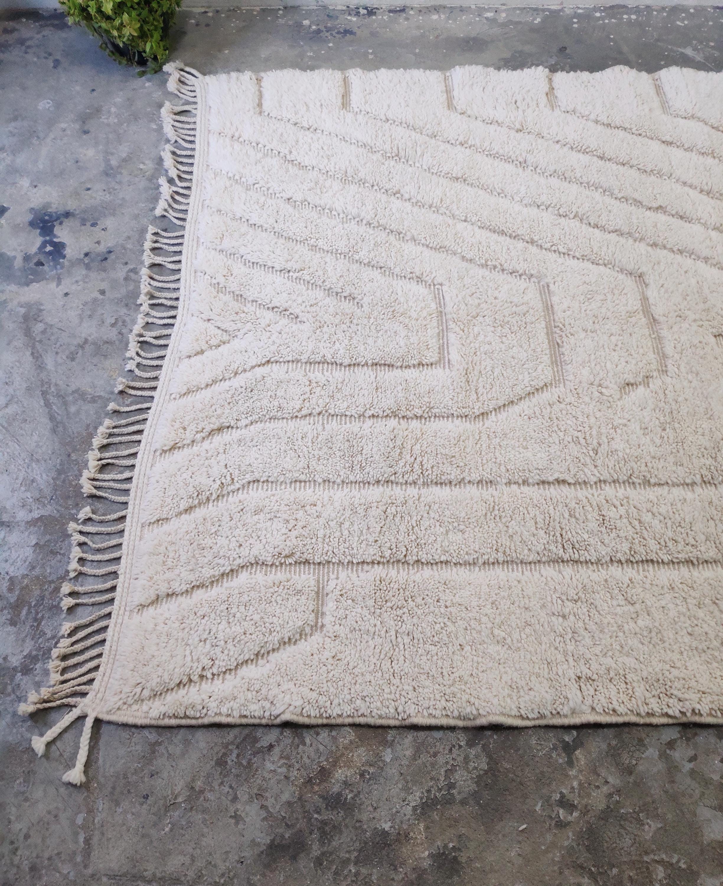 This exquisite traditional Moroccan rug froma Bani Ourin is 100% handmade. Beni Ourain rugs from a small family from the Middle Atlas Mountains in the Taza region. A small groupa called Beni Ourain, are known for their wonderful idea of sheep wool, making their rugs move using The best quality of standard wool. For the people of Morocco, this business is closed witha the things and materials they have available, for example their sheep and the wool they produce. Some parts of the world are a great place to produce excellent wool and the sheep from this region probably produce the best down in the world. Made from the finest wool, each thread is carefully selected and meticulously woven, a creating a luxurious and long-lasting masterpiece that will stand the test of time. The patterns woven into the rug tell the story of the artisan's creativity and reflect the unique aesthetics of Berber traditions.