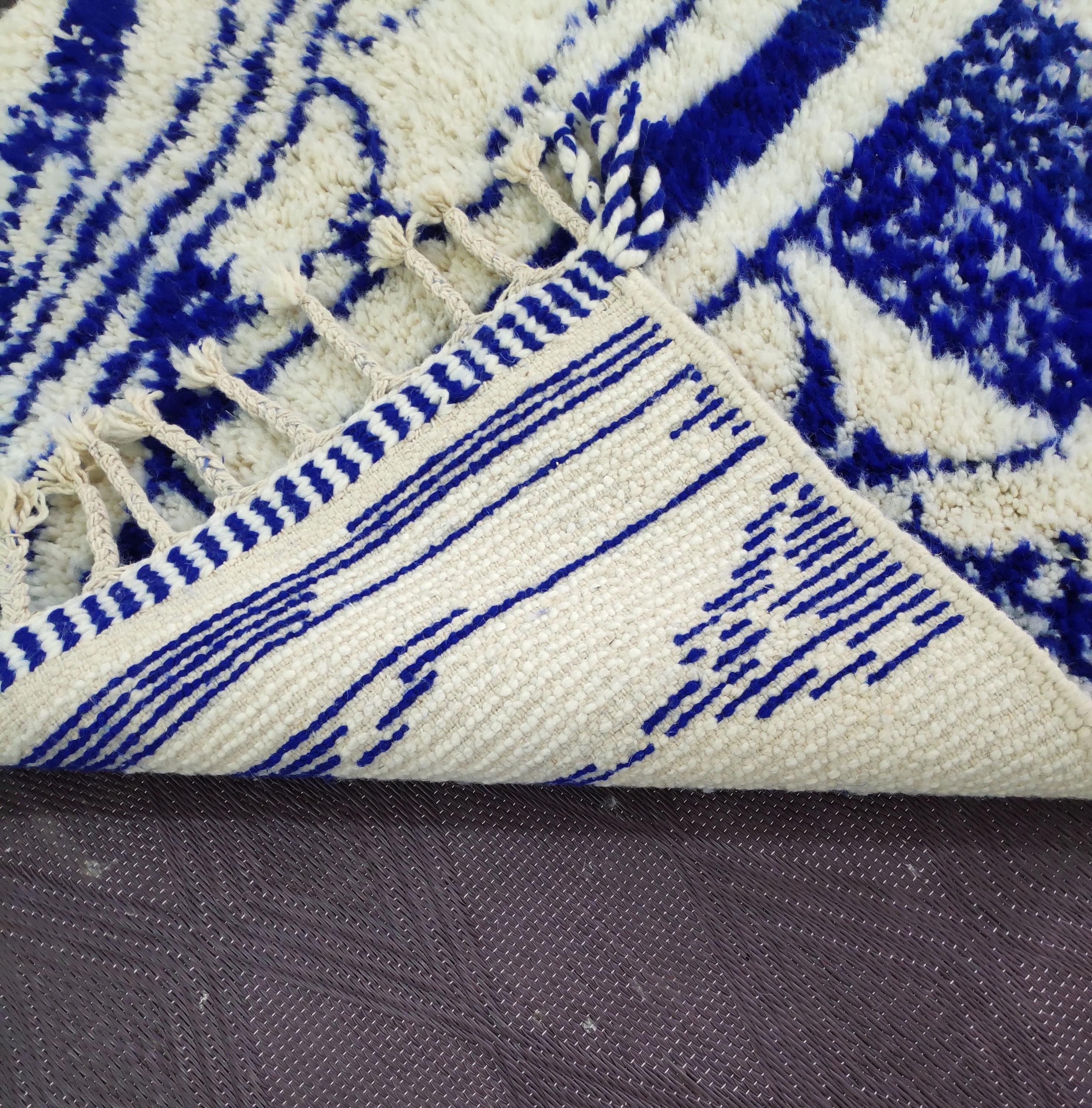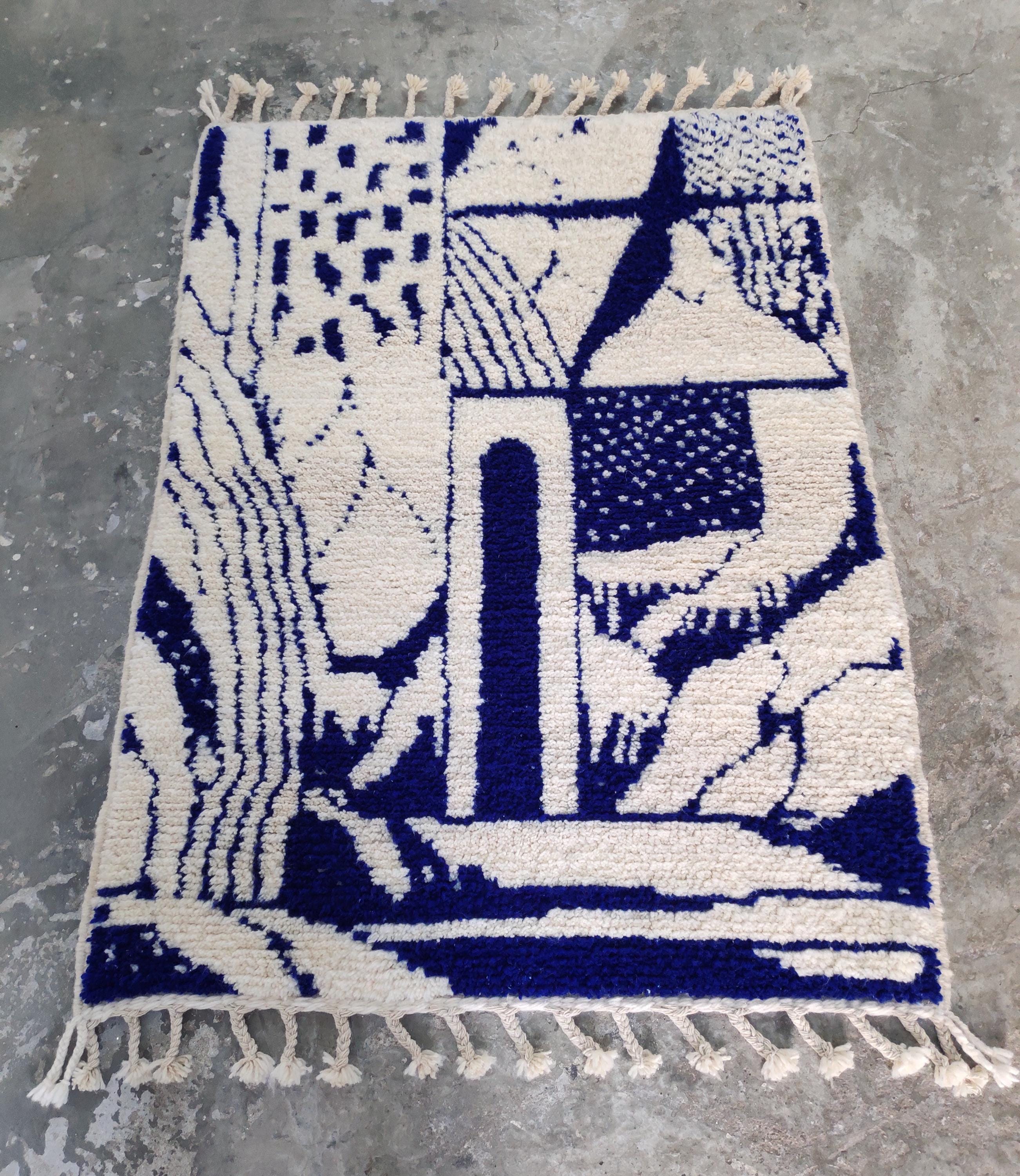 Imagine stepping onto a cloud woven with stories. This isn't just a rug; it's a vibrant echo from the heart of Morocco's High Atlas Mountains. Hand-knotted by the skilled hands of Berber women, each knot carries the legacy of generations, imbued with their artistry and spirit. The captivating dance of deep indigo blue against the creamy ivory wool tells a unique visual tale, a bold geometric narrative that will infuse your home with warmth, texture, and an undeniable sense of soul. Feel the luxurious softness underfoot and let this authentic Azilal rug become a cherished centerpiece, sparking conversations and adding a touch of nomadic artistry to your everyday life. Own a piece of livinghistory, a testament to enduring craftsmanship.