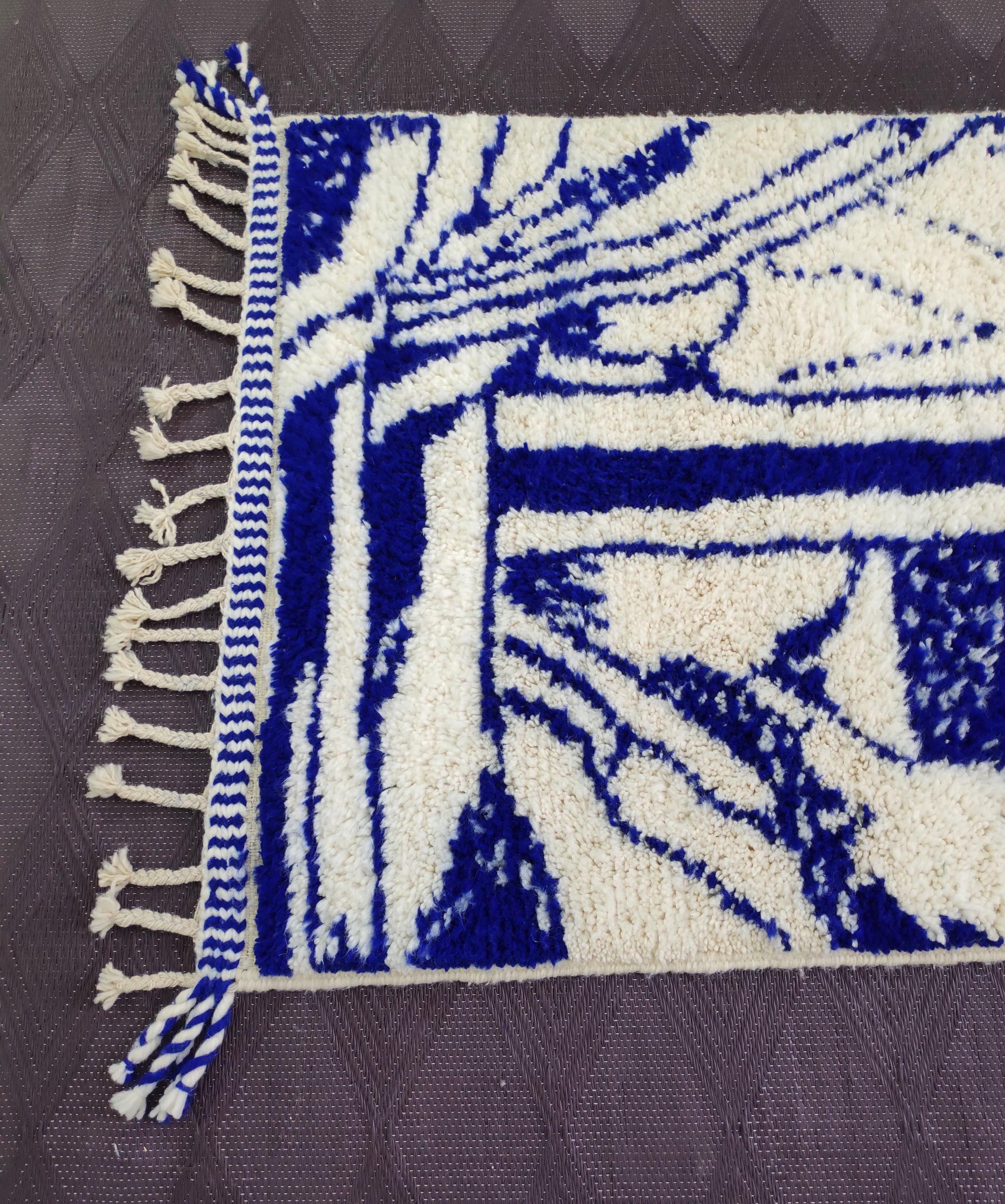 Tired of the ordinary? Prepare to be captivated by this truly exceptional Azilal Berber rug. Its bold and dynamic blue and white geometric design isn't just visually stunning; it's a statement.