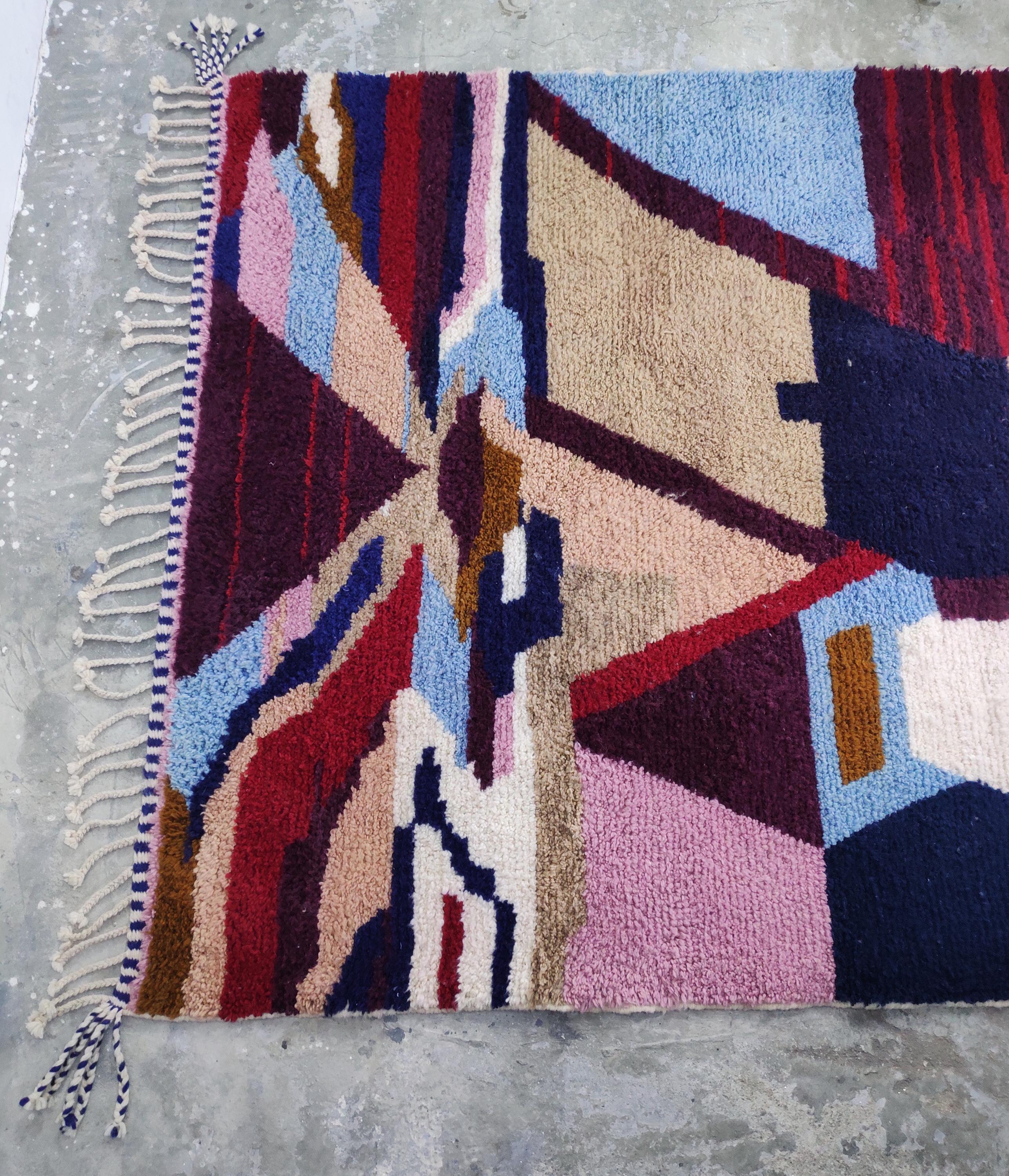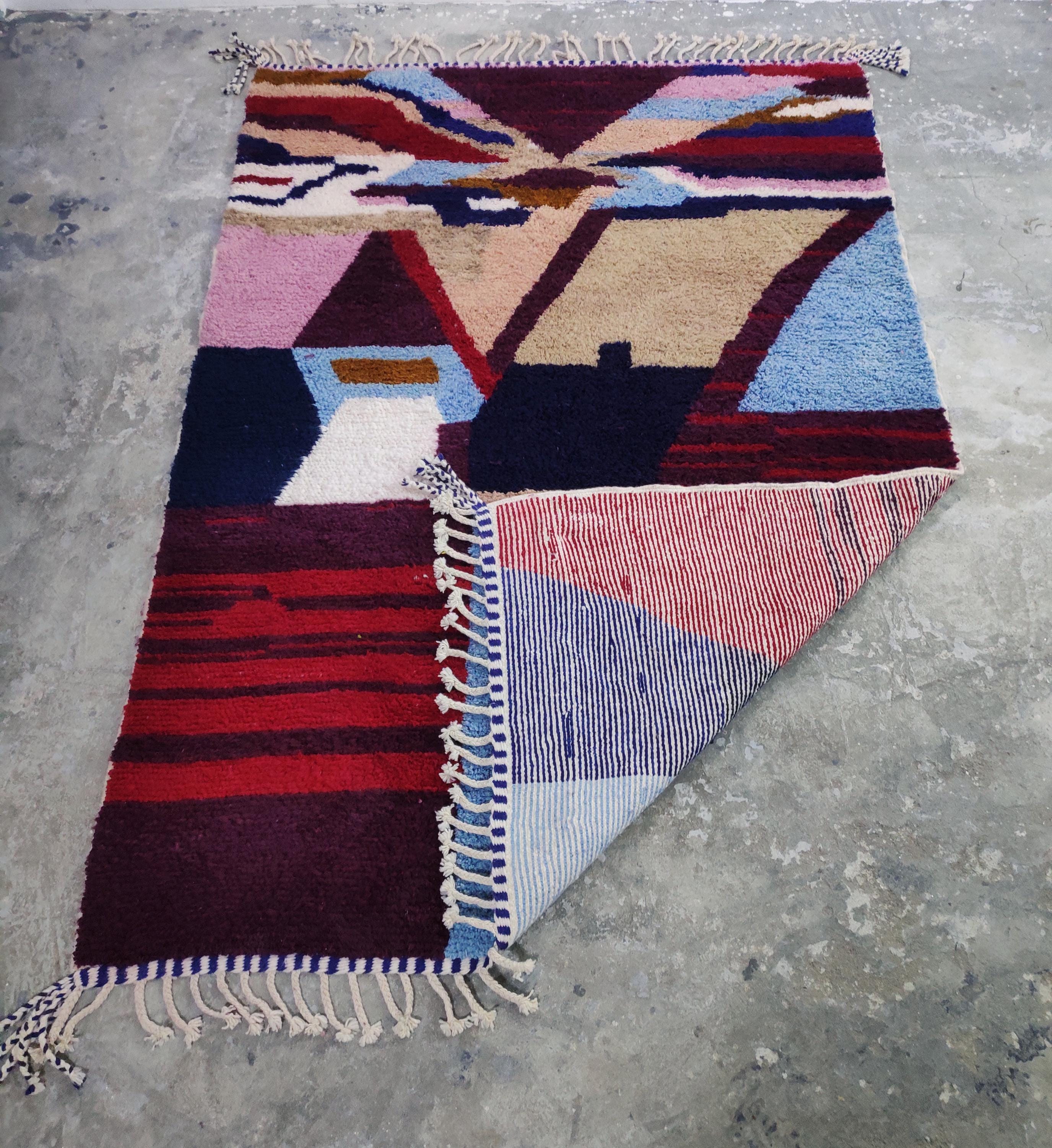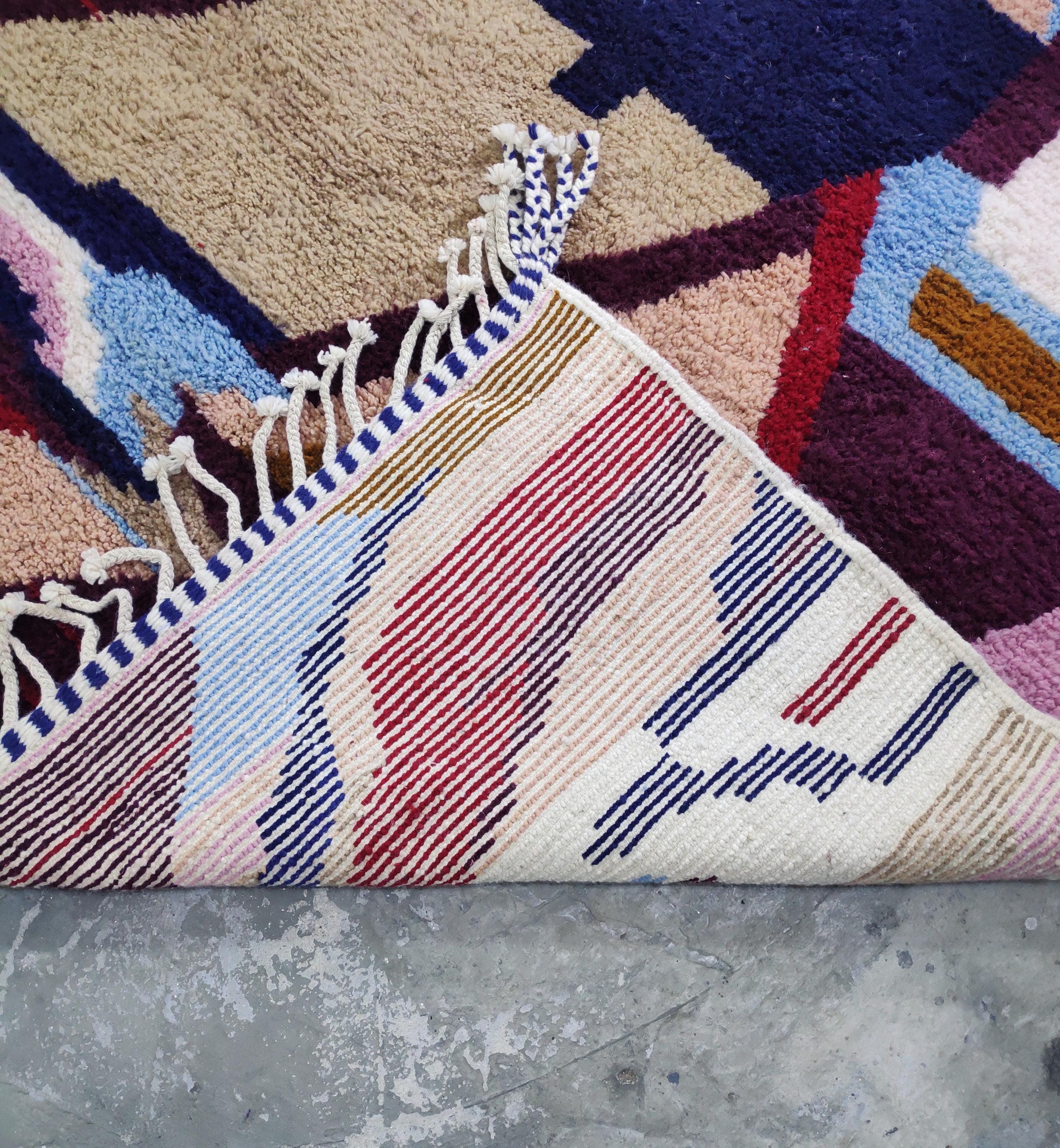 "Immerse your living space in the captivating artistry of Morocco with this exceptional, handcrafted rug. Woven with passion and skill, this unique piece showcases a vibrant tapestry of bold colors and a distinctive geometric design that effortlessly blends traditional Moroccan aesthetics with a contemporary sensibility. The plush texture underfoot speaks to the quality of the craftsmanship, inviting warmth and comfort into your home. More than just a floor covering, this rug is a statement piece, a conversation starter that reflects a rich cultural heritage and an eye for unique design. Imagine it anchoring your living room, adding a touch of bohemian flair to your bedroom, or bringing an artistic touch to your entryway. This meticulously created Moroccan rug is a testament to the enduring beauty of handmade textiles, promising to be a cherished addition to your décor for years to come, infusing your space with character, warmth, and a touch of exotic elegance."